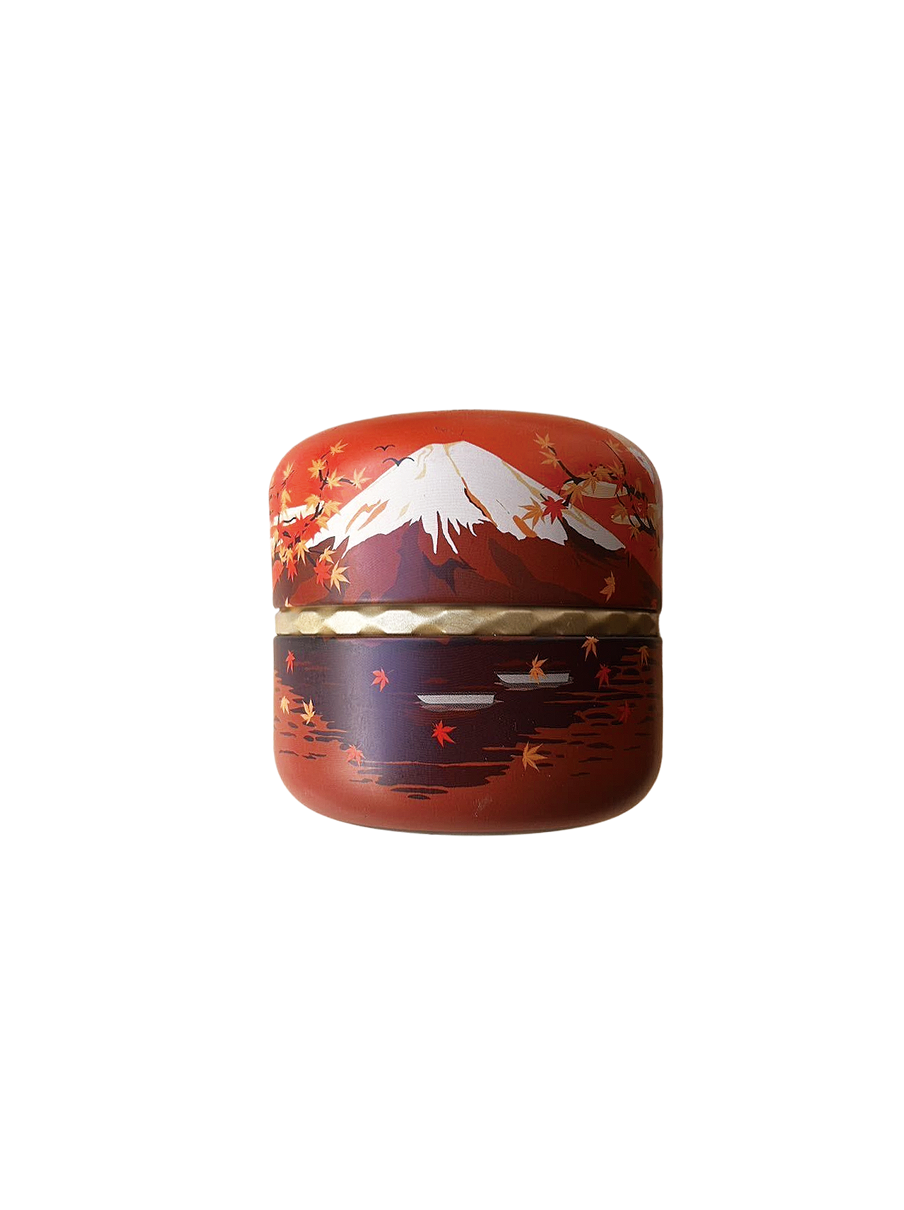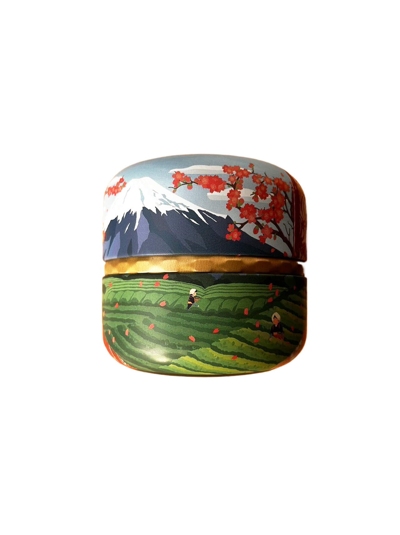 This tea can features a stunning and vibrant design inspired by traditional Japanese landscapes and cultural elements. The lid showcases a snow-capped Mount Fuji against a light blue sky, with branches of cherry blossoms (sakura) blooming in bright red, evoking a serene springtime scene. The cherry blossoms add a touch of elegance and natural beauty, symbolizing renewal and the fleeting nature of life in Japanese culture.