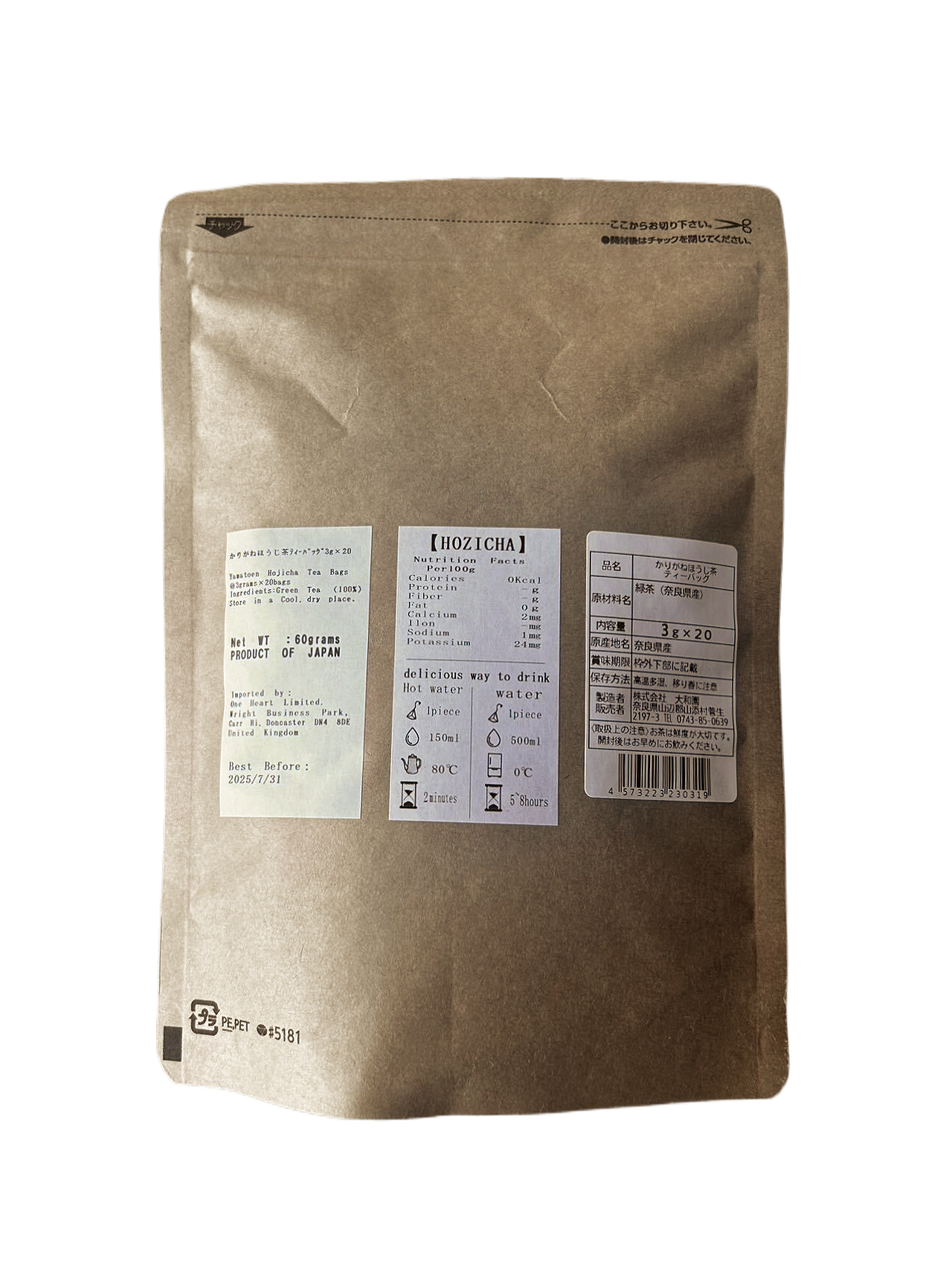 - Roasted Green Tea Leaves: The teabags contain Hojicha, which is made by roasting green tea leaves (typically bancha or lower-grade sencha) over high heat. The roasting process gives the tea its signature deep, smoky, and earthy flavour.